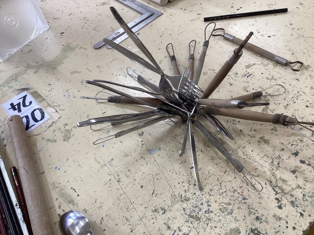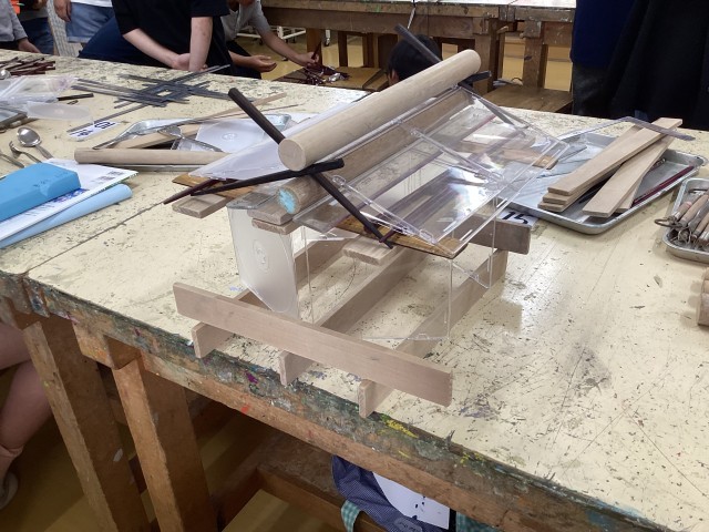 鉛筆や箸、たたら板、粘土べら、定規などがたくさん!普段なかなかできない用具遊びに意欲をもって取り組みました。