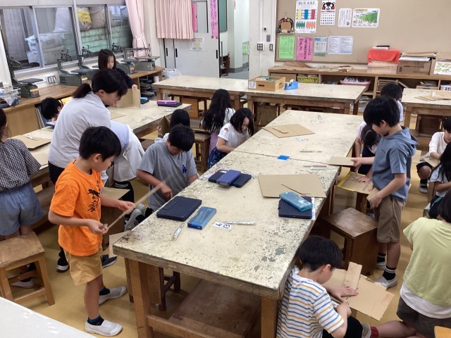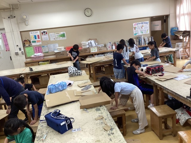 段ボールカッターの安全な使い方を確かめて、板段ボールをザクザクと切って好きな形をつくりました。