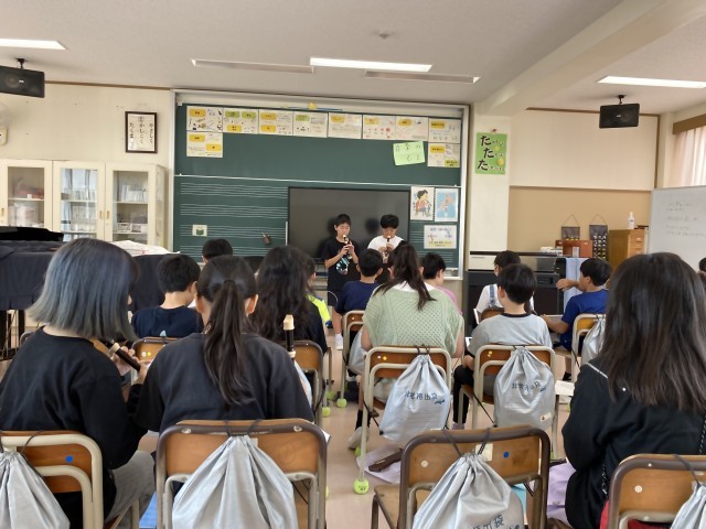 5年生の音楽の学習で、リコーダーの発表会を行いました。美しく輪奏(ずれて重ねて演奏)をするためには相手の音をよく聴かないと合わせることができません。