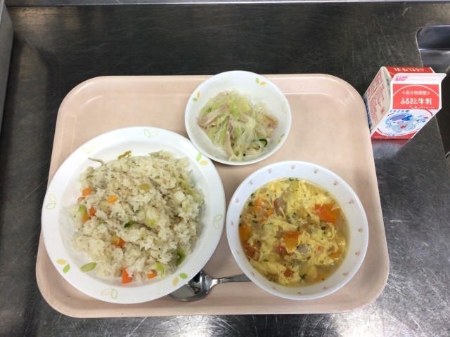 本日の献立 レタスとじゃこのチャーハン 牛乳 卵スープ バンサンスー