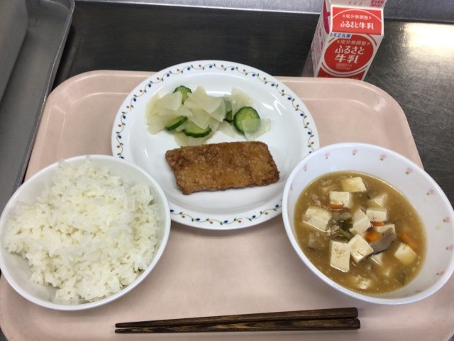 本日の献立 ごはん 牛乳 いかのいかりんとあげ 麻婆汁 大根ときゅうりのごま風味