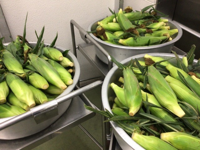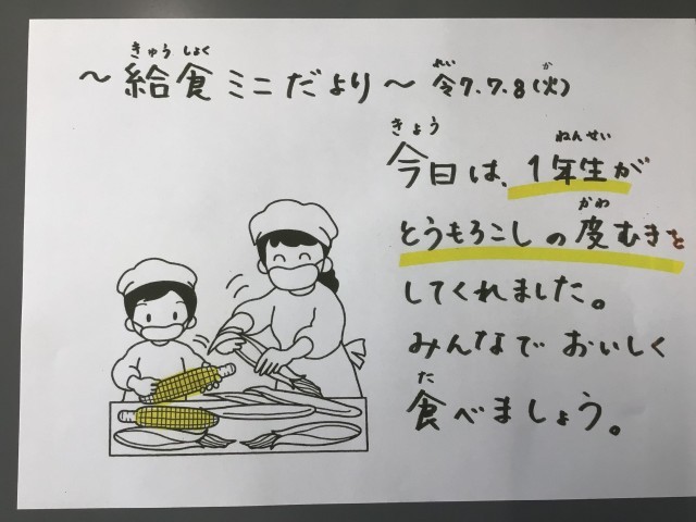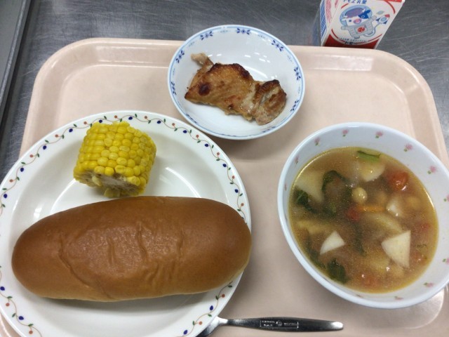 本日の献立 黒砂糖パン 牛乳 照り焼きチキン ゆでとうもろこし ミネストローネ