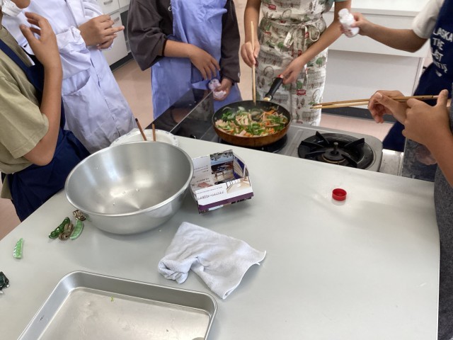 3時間目、校内でとてもいい香りがしてきたので、匂いのもとを辿っていくと、6年1組が家庭科室で、調理実習で野菜炒めを作っていました。