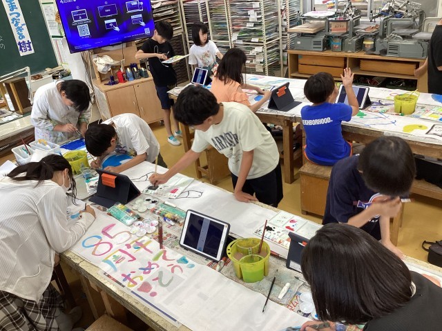 6年生は絵の具、墨、凧絵の具を用いて3メートルの大きな絵を描きます。