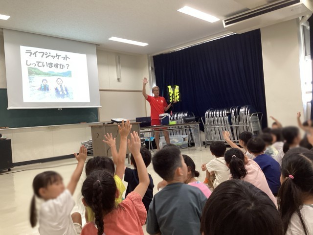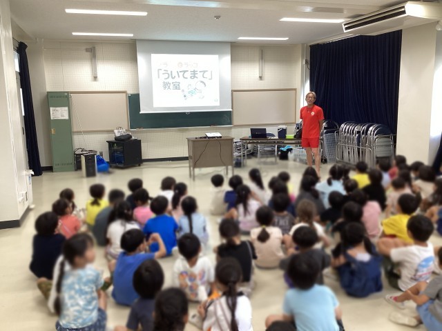 万が一水の中に落ちた時には「ういてまつ(ラッコうき)」ということを学びました。人間の体の風船である肺にしっかり息を入れて静かに待つことがよいそうです。(助けを求めて声を出すと、沈んでしまうため)そのほかにもライフジャケットのことや浮くものは何かなどいろいろなことを学びました。この機会にお家でも水の事故から自分の身を守るためにすることは何かを話して、安全に過ごしてほしいと思います。