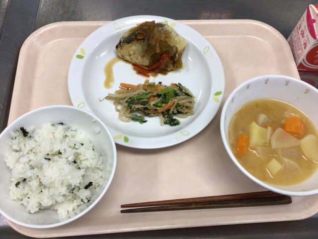 本日の献立 わかめごはん 牛乳 魚の南蛮漬け 野菜のごまあえ みそ汁