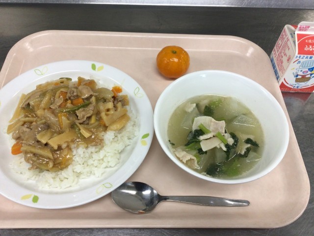 本日の献立 スタミナ丼 牛乳 豚と冬瓜のスープ 冷凍みかん