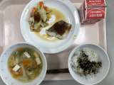 本日の献立 麦ごはん ふりかけ 牛乳 魚のバーベキューソース(ゆで野菜添え) ...