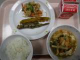 本日の献立 ごはん 牛乳 ししゃもの二色揚げ ごま酢かけ 生揚げそぼろ 本日の...