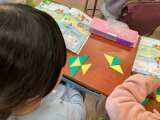 1年生の算数「かたちづくり」です。色板の形に着目して、色板をずらしたり回したり裏...