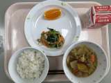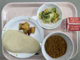 本日の献立 ナン 牛乳 キーマカレー コーン入りフレンチサラダ シナモンポテト ...