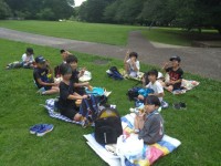 社会科見学11砧公園到着!ちょうど12時にお弁当を食べ始めました!М