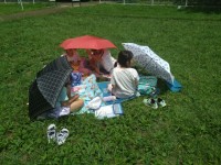 社会科見学13わざわざひのあたるところで、傘をさしながら食べています!そろそろ、...
