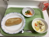 本日の献立*ココアパン*牛乳*白いんげん豆の田舎風スープ*じゃがいものチーズ焼き...