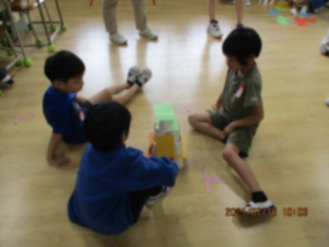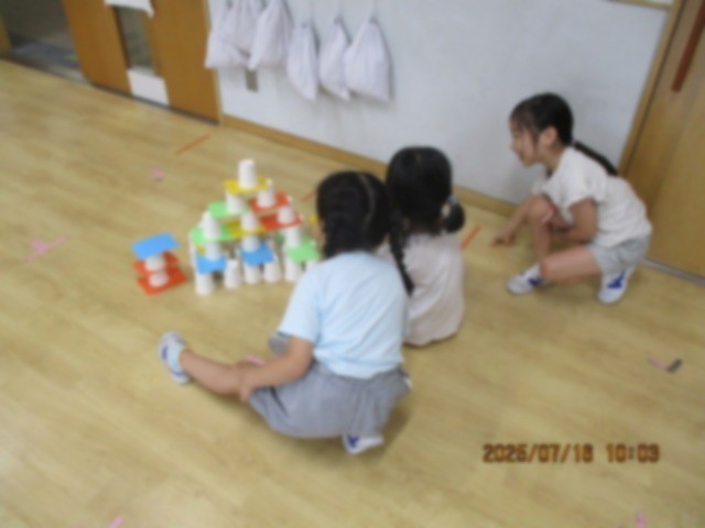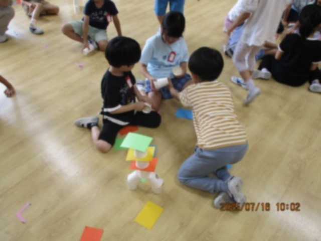 紙コップと色画用紙を並べたり重ねたりする造形遊びに取り組んでいます。ピラミッドのような作品やお城のような作品など、子どもたちの大いに発想力を発揮して遊んでいました。