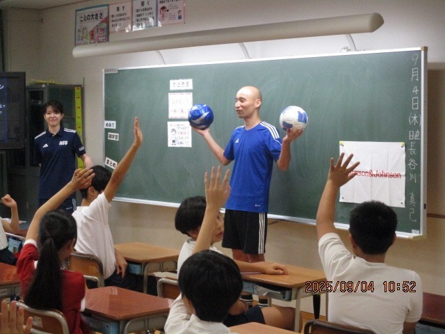 ロービジョンフットサル日本代表の角谷佳祐選手をお招きしました。障害のある人がどのように工夫し、協力しながらスポーツを楽しんでいるかを知ることができました。御来校いただき、ありがとうございましおた。