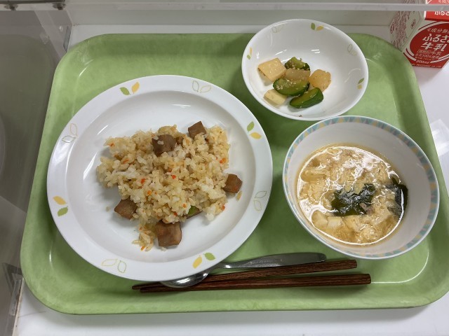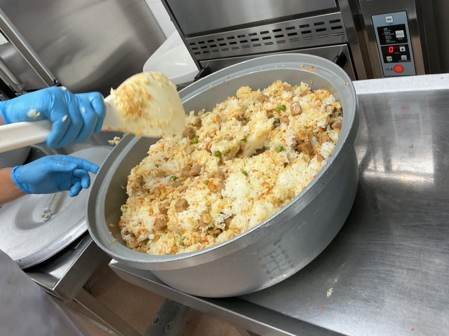 ゴロゴロと多めにカットしたチャーシューが入ったチャーハンを各学級ごとに配缶しています。味が均等になるように、しっかりと混ぜています。