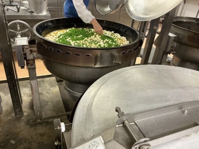野菜やこんにゃく、うずら卵も加えたそぼろ煮を大きな釜で調理しています。最後にさやいんげんを加え、中心温度を確認していきます。