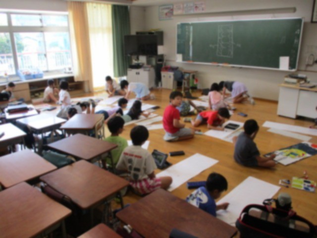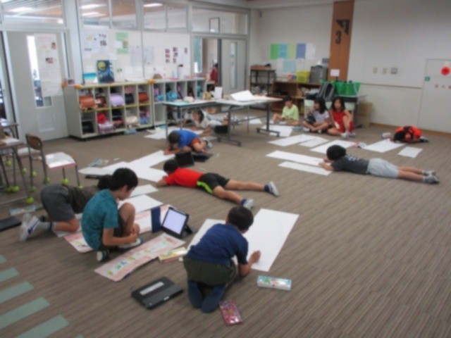 画用紙を2枚を縦につなげた長い用紙に、思い思いの家を描いています。画用紙が机に入りきらないので、床で描いています。自由な姿勢で描くことで、自由な発想が引き出されているように感じます。