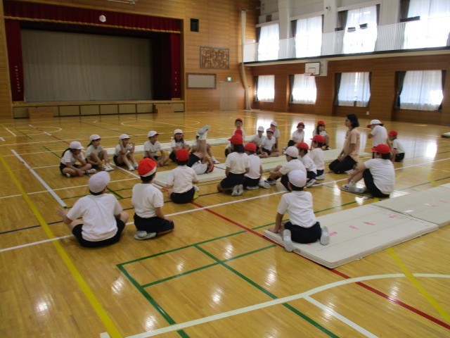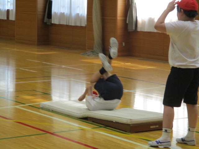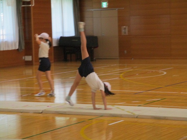 マット運動です。マットに傾斜をつけた場を用意するなど、個々の技量に応じて練習に取り組んでいます。中には側方倒立回転に挑戦する児童もいて、皆大変意欲的でした。最後に、友達の演技を見合いました。