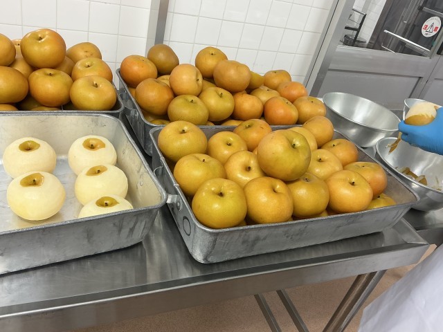 梨を洗い皮をむいています。旬の果物を食べて、季節を感じる献立にしました。