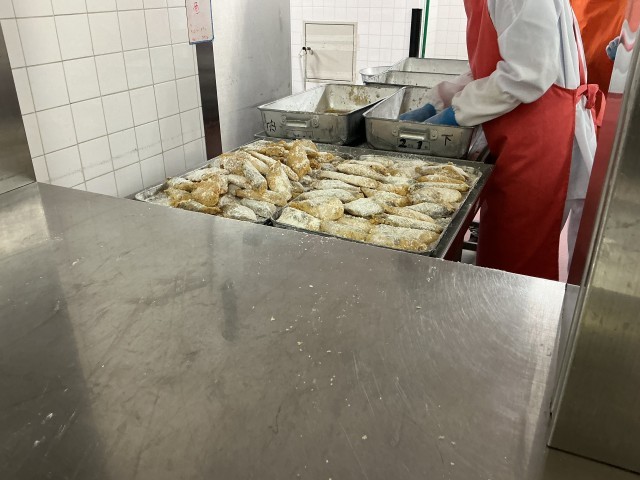 しょうゆダレに漬けた白身魚に片栗粉をまぶして上げていきます。均等に片栗粉がつくように、片栗粉の量も計量しています。
