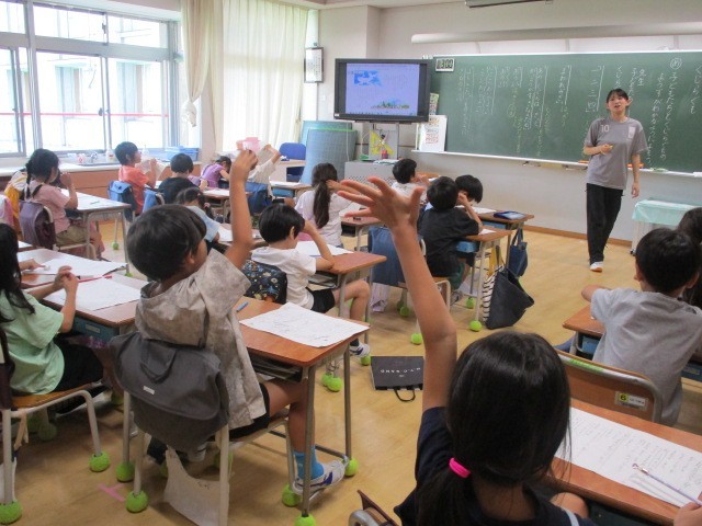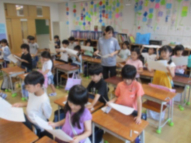 「くじらぐも」を学習しています。会話文をどのように読んだら物語の様子が伝わるかを考えました。「『すき』という言葉だから、明るく読んだら良いと思う」など、様々な意見が出ました。