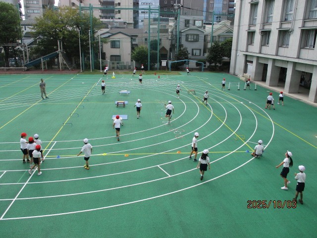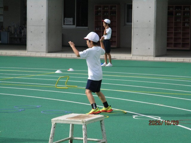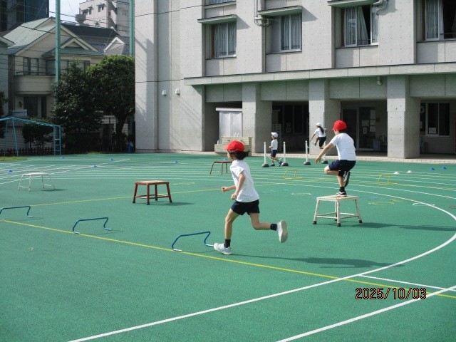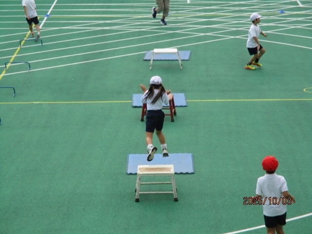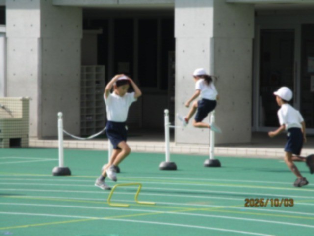 子どもたちが体を動かす楽しさを感じられるように、様々な場を用意しています。ミニハードルを走り越したり、リズム良くケンケンパをしたり、飽きずにたくさん取り組めるような工夫がたくさんしてあります。