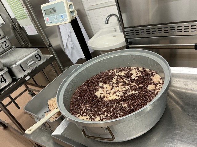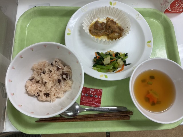 10月15日は開校記念日、今日は1日早い開校記念日給食です。給食室で赤飯を炊き、菊花や紅葉生麩も献立に加えた見て楽しめる給食にしました。
