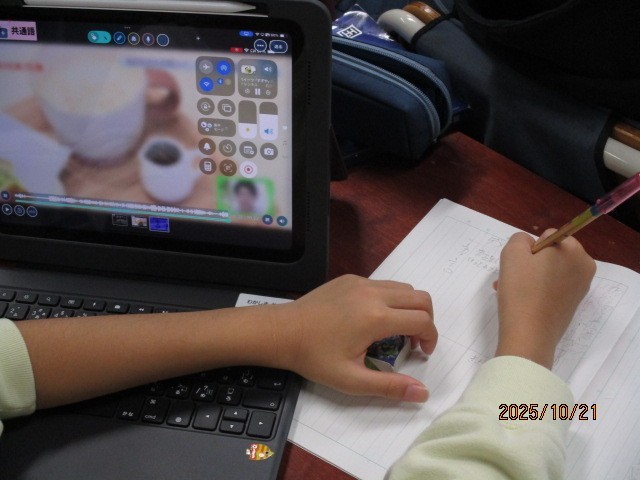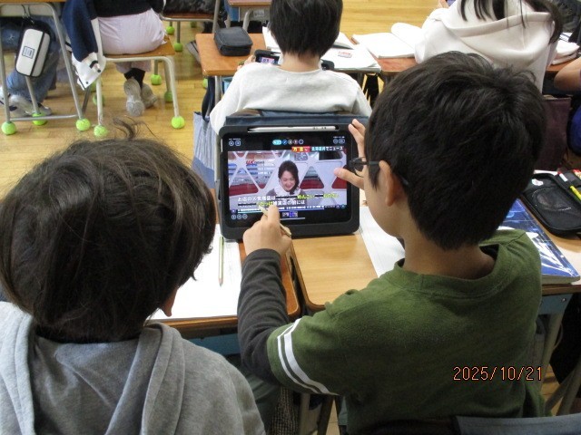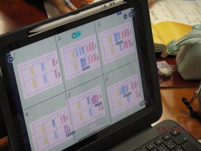 方言と共通語について学んでいます。デジタル資料を見ながら、それぞれのメリットやデメリットを比較し、どのように使い分ければ良いのかを考えました。皆の考えはタブレットで共有し、各自が考えを深めていました。