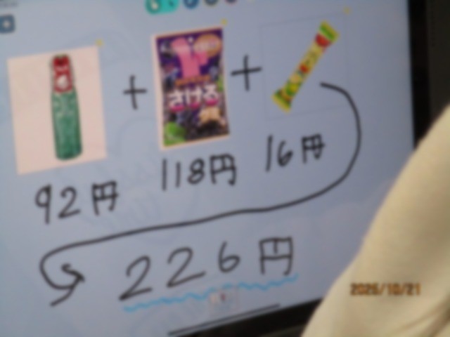 まだ習っていない計算式が書いてありました。中に入ってみると、遠足のおやつを考えていました。300円以内であることや消費税がかかることなど、いくつかの条件に当てはまる必要があり、どの子も一生懸命に考えていました。