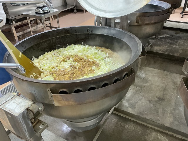 具だくさんな豚丼をつくっています。長ねぎやしらたきなど食感も楽しめるような1品にしました。