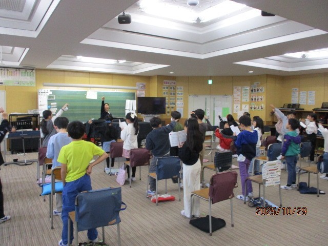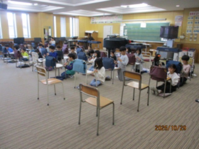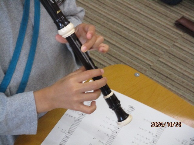 クラスの友達が歌集から1曲選び、それをみんなで歌っています。今日の子は、「変わらないもの」を選びました。また、リコーダーの正しい指遣いを練習してしました。