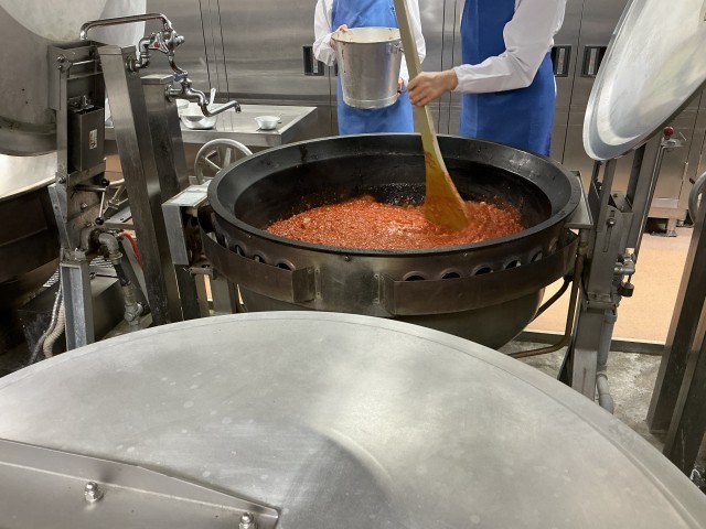 玉ねぎのみじん切りをたっぷりと加えたミートソースを煮込んでいます。スパゲテイにたっぷりとかけて、子どもたちはしっかりと食べていました。