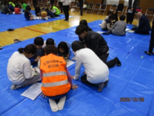 地域の方と一緒に防災学習を行いました。避難所で自分たちができることは何かについて、意見を出し合いました。また、その意見を地域の方に聞いてもらいました。お忙しい中多くの方に御参加いただき、ありがとうございました。