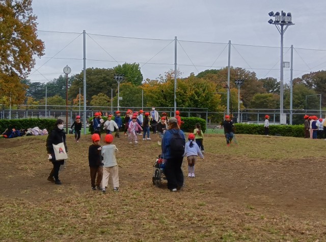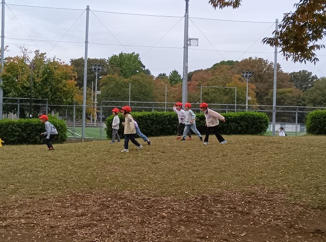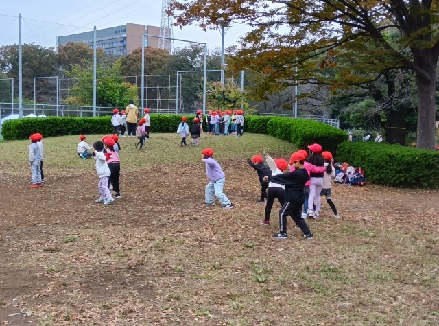 1年生は、だるまさんが転んだで遊んでいます。