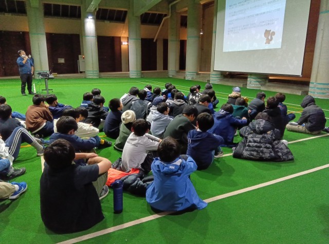 夜の活動、箸作りが始まりました。最初に今回使用する間伐材とは何かについて学んでいます。