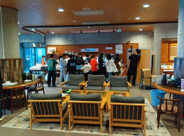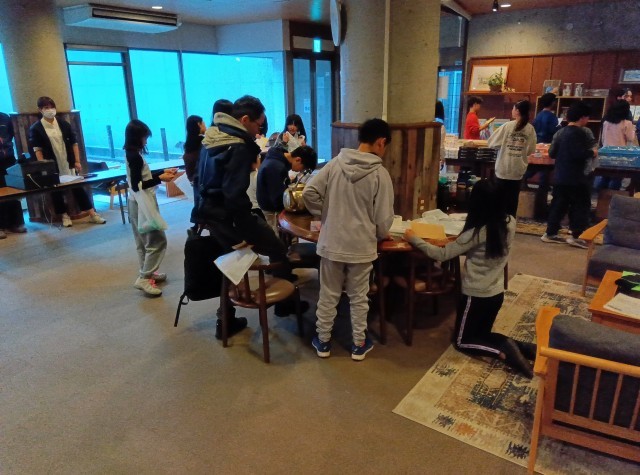 クラスごとにお土産タイムです。担任からお金やレシートの管理について説明を受け、それぞれが買い物をしています。