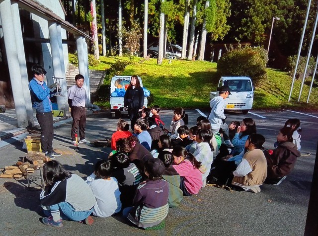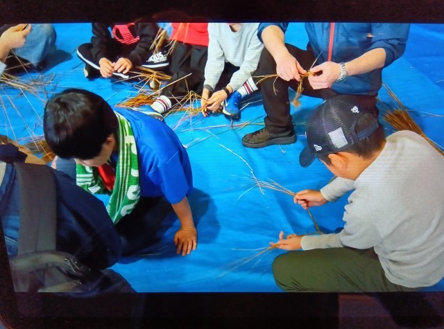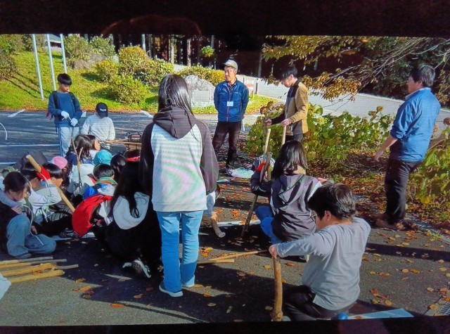 里山体験プログラムです。薪割り、ロープワーク、藁縄づくりなど、様々な体験を準備してくださいました。