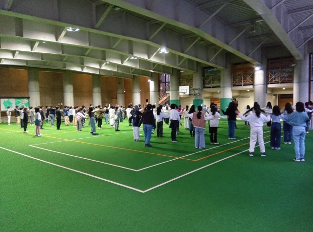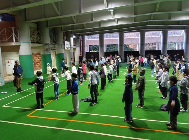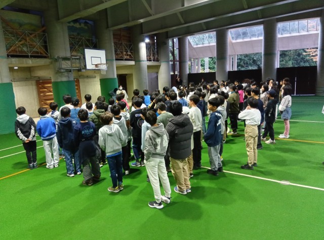朝会です。今朝も大きく体調を崩す子はいません。この後は、村めぐり〜りんご狩り〜田園プラザで昼食・買い物です。