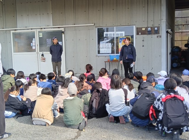 宮田果樹園に到着しました。この後、農業やりんご栽培の話を聞き、いよいよりんご狩りです。
