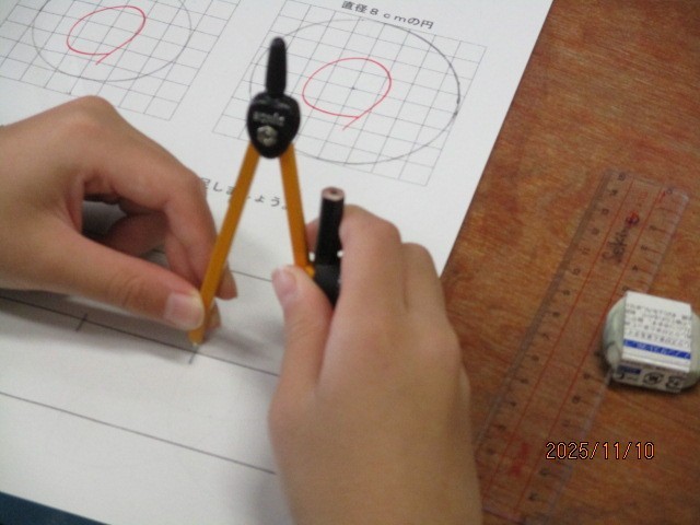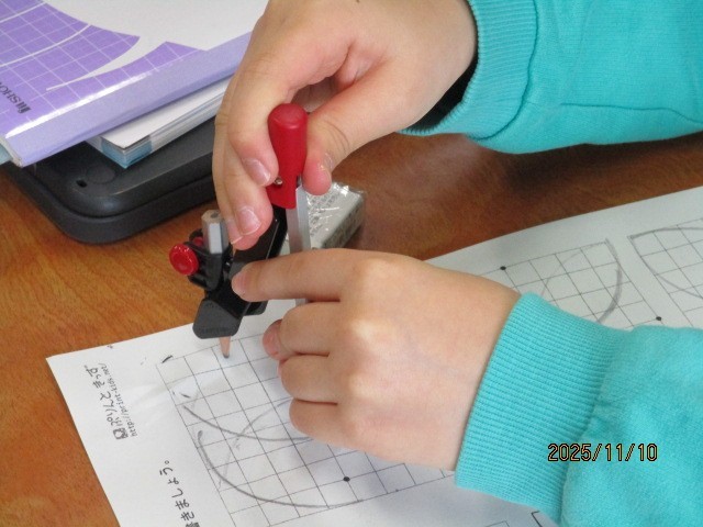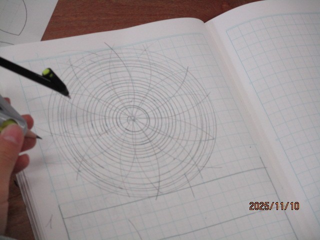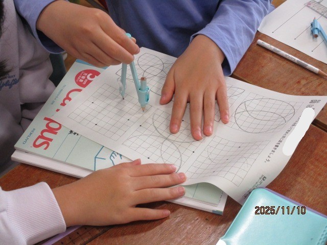 コンパスの使い方を学んでいます。力の加減や手首の回し方など、慣れるまでに少し時間が必要です。繰り返し使う中で徐々に慣れていきます。問題が全て終わり、複雑な幾何学模様を描いている子もいます。