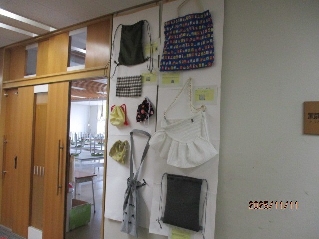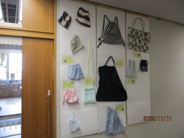 授業で作ったナップザックや手提げ、巾着が飾られています。どれも力作だらけで、見ているだけで創作意欲がわいてきます。