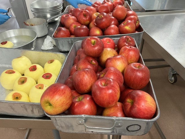 今日のりんごは青森県産のシナノスイートです。1個ずつ皮をむき、塩水にサッとつけて変色を防いでいます。