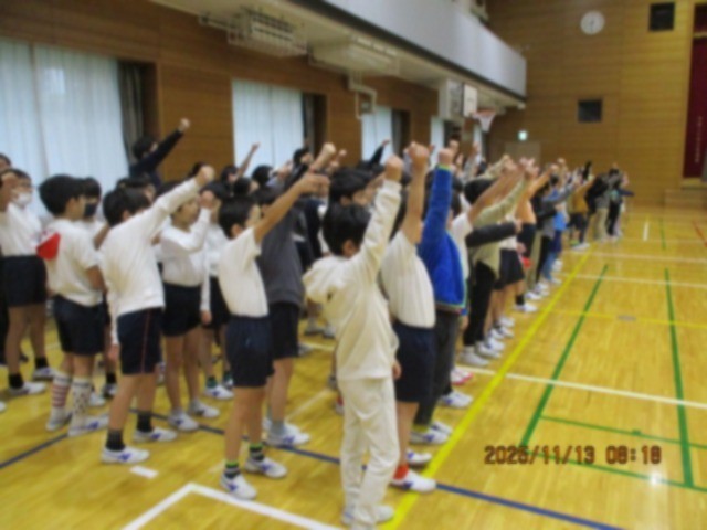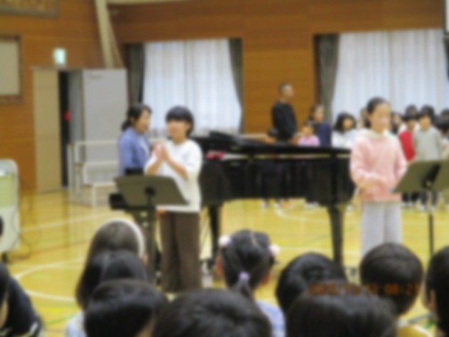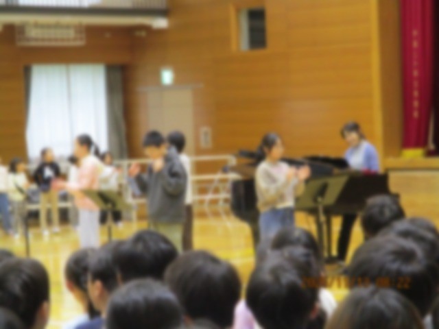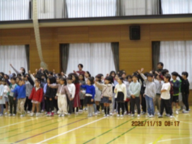 「うたえバンバン」を歌い、「オレ!」に合わせて元気良く拳を掲げました。今回は6年2組の子たちが指揮者を担当しました。体育館を退場するときに、自然と子どもたちから歌声が聞こえてきました。音楽好きが育っています。