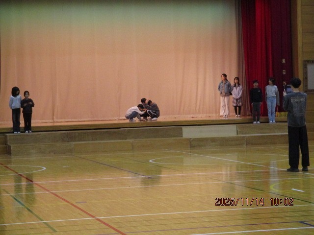 グループごとに台本を練ったり小道具を作ったり、子どもたちが自らの手で作り上げようと取り組む姿がたくさん見られます。体育館では、立ち位置などを確認しています。