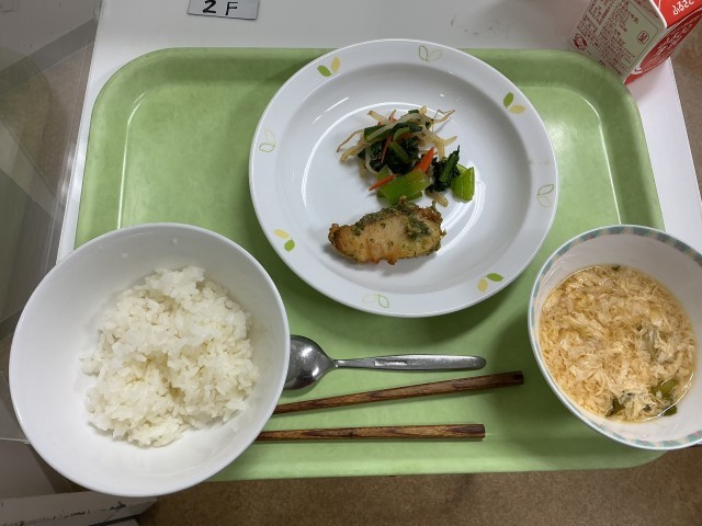 収穫されたばかりの有機米を白ごはんに炊きましたので、ごはんに合う和食献立にしました。揚げたての磯辺揚げは青のりの風味がおいしい1品です。
