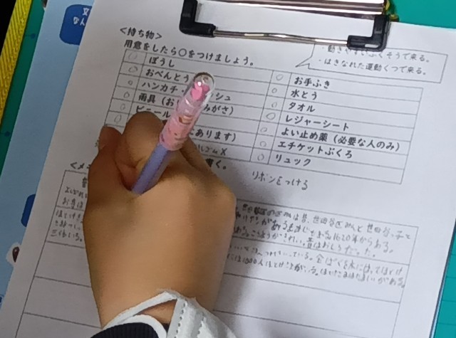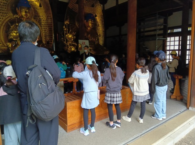 阿弥陀如来像を見学しています。お話の内容を細かくメモしている子もいます。