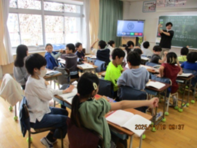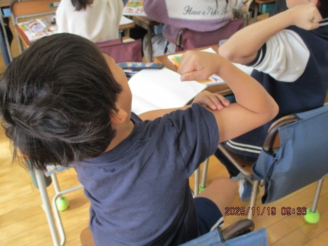 体のつくりとはたらきを学んでいます。腕を曲げて力を入れると力こぶができます。触ってみると、柔らかった筋肉が固くなっています。このような体の不思議について学んでいます。