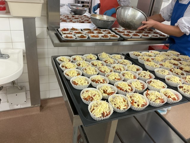 11月20日はピザの日です。角切りの秋鮭をカップに乗せ、手作りピザソースとチーズを乗せてオーブンで焼きます。調理員さんたちが分担を決めて均等に乗せています。